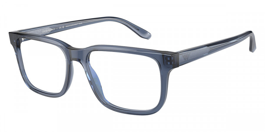 Emporio Armani EA3218 5072 53 eyeglasses in Shiny Transparent Blue. The 5072 Shiny Transparent Blue color frame features Acetate Rectangle Shape in size 53-17-145.